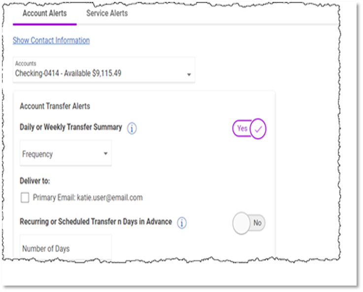 Freely subscribe/unsubscribe to account, service and ACH alerts and stay informed of all your account activity.